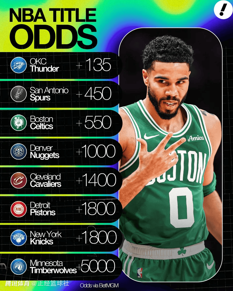 1. 雷霆:+135 2. 马刺:+450 3. 凯尔特人:+550 4. 掘金:+1000